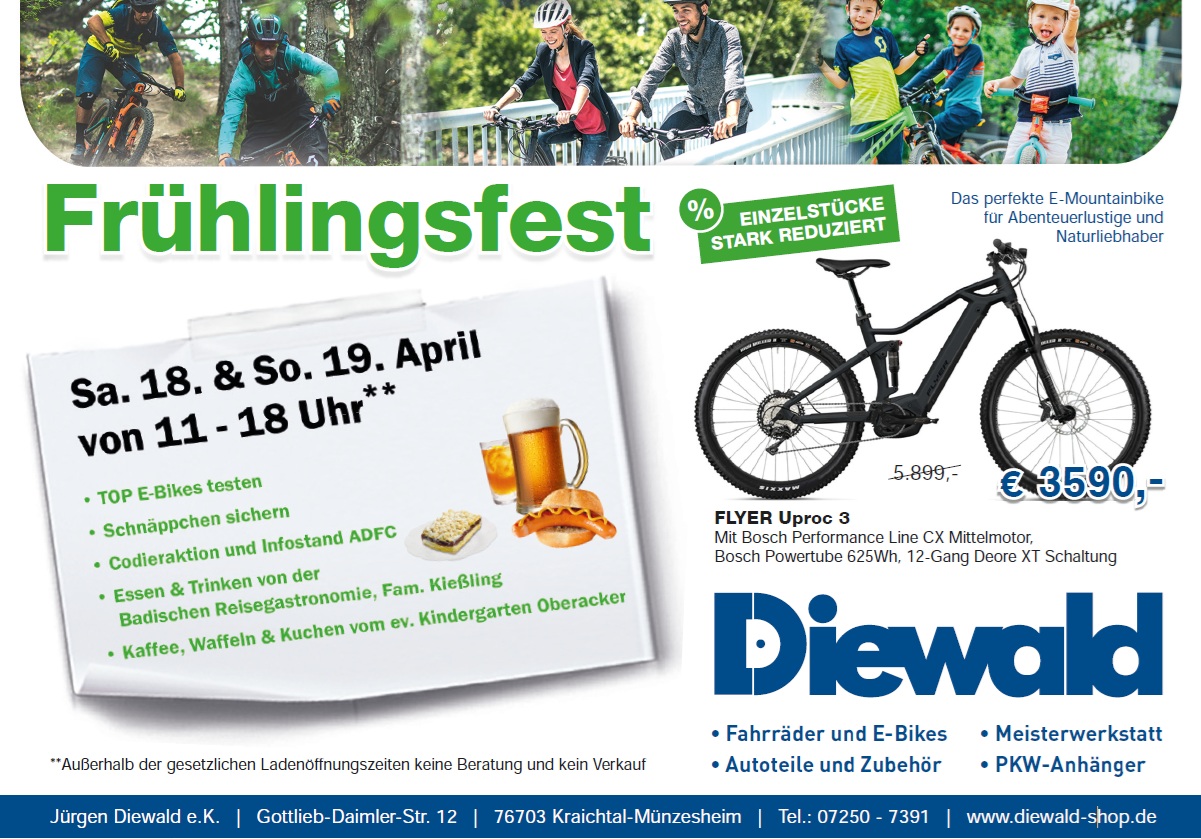 Ihr Autoteile und Zweiradhändler mit umfangreicher Ausstellung aktueller Modelle von namhaften Herstellern. Wir bieten Ihnen einen kompetenten Service wenn es um Autoteile oder ums Zweirad geht. Die Firma Diewald wurde 1994 von Inhaber und Meister Jürgen Diewald gegründet. Seither hat sich der Betrieb konsequent zu einem Unternehmen entwickelt, welches sich auf die Bereiche Zweirad inklusive Reparaturservice, Autoteile und Zubehör spezialisiert hat. Seit 25 Jahren sind wir für unsere zufriedenen Kunden aus dem Raum Kraichtal,Bruchsal, Bretten, Kronau, Östringen, Odenheim, Ubstadt- Weiher Zeutern, Knittlingen, Oberderdingen da. Bei uns werden sie fündig vom Kinderfahrrad über Mountainbike, Cityfahrrad, Trekkingfahrrad bis hin zum E-Bike oder Pedelec. Eine professionelle Beratung und ein großes Angebot an Zubehör und Ersatzteile erwartet Sie. Wir freuen uns auf Ihren Besuch